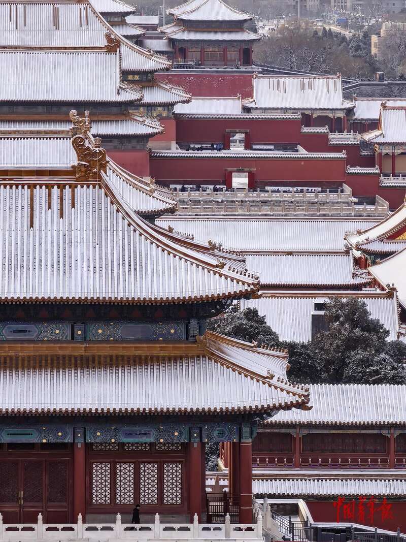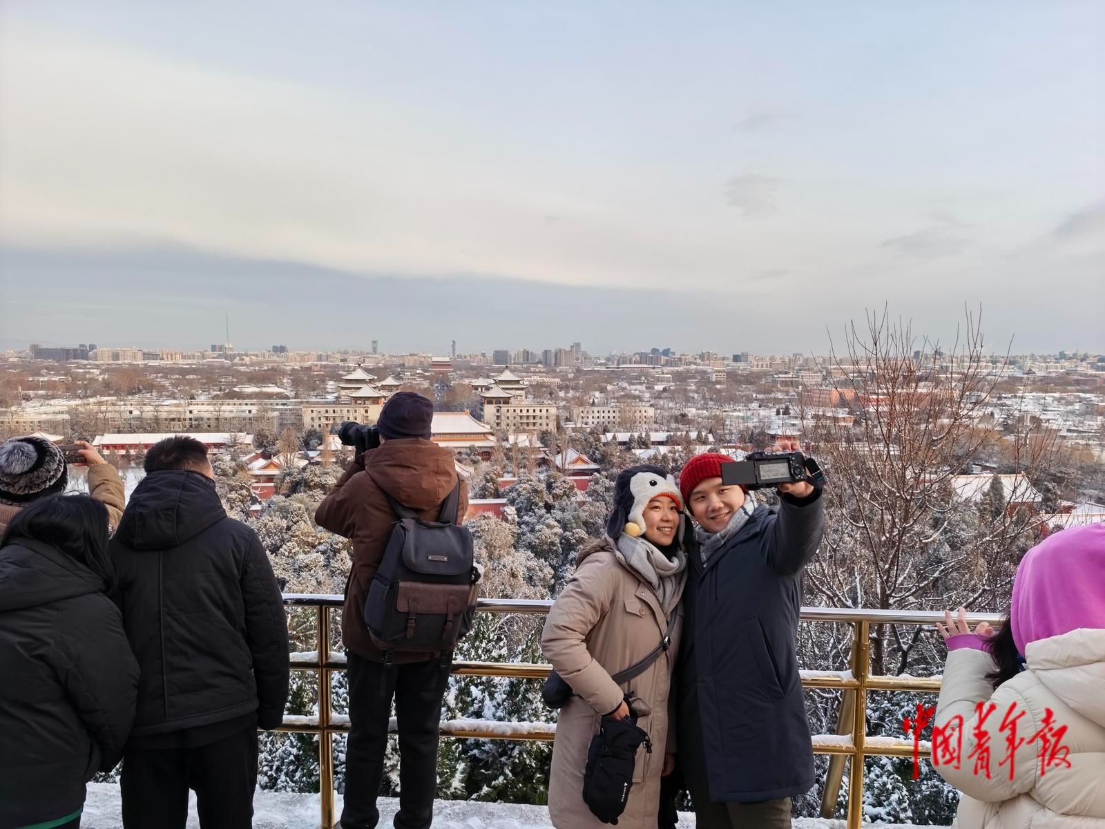 北京初雪后 景山公园“故宫绝佳观景位”迎来打卡潮
