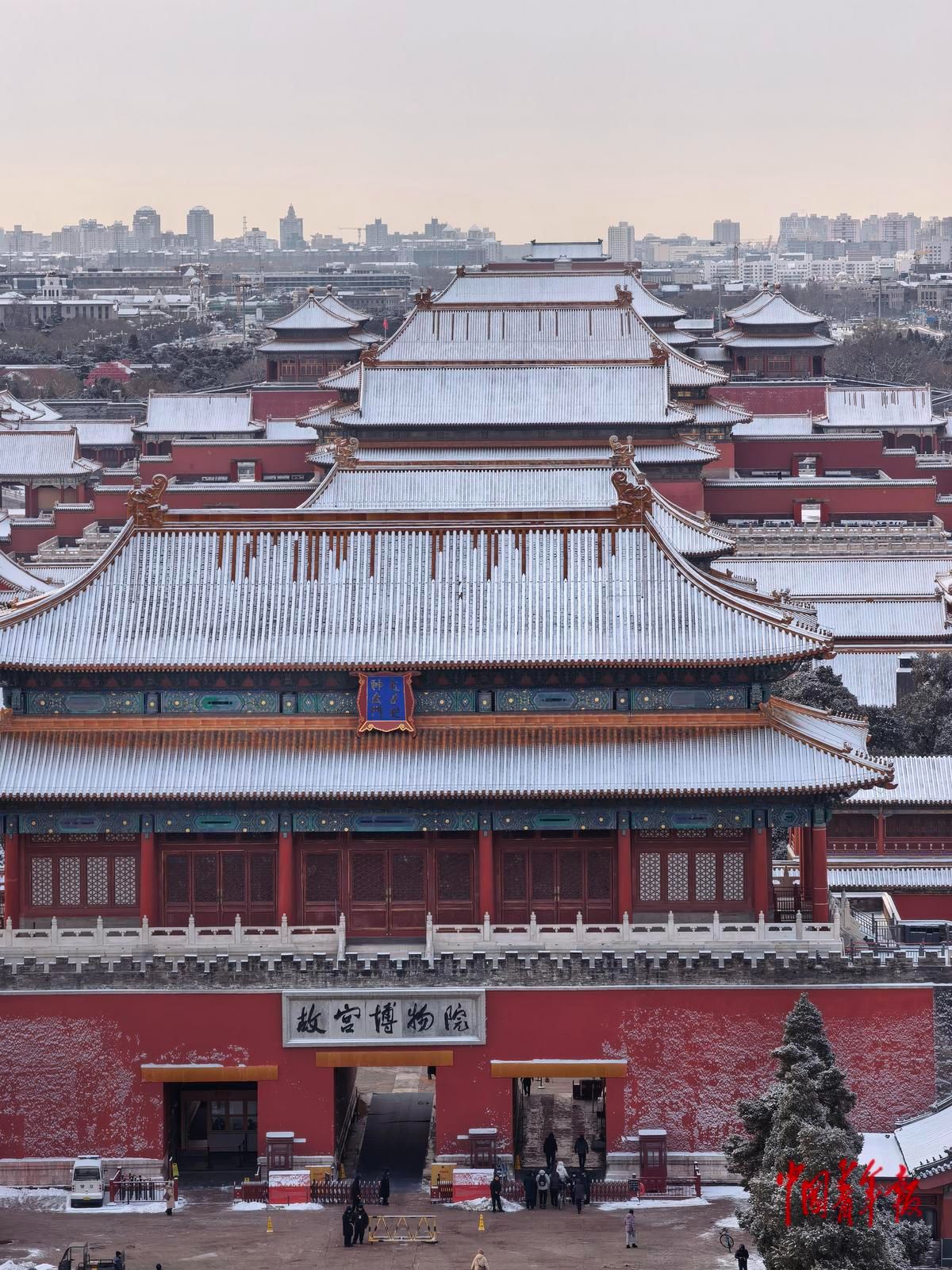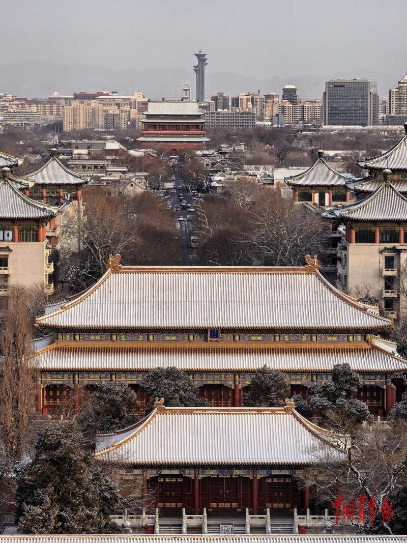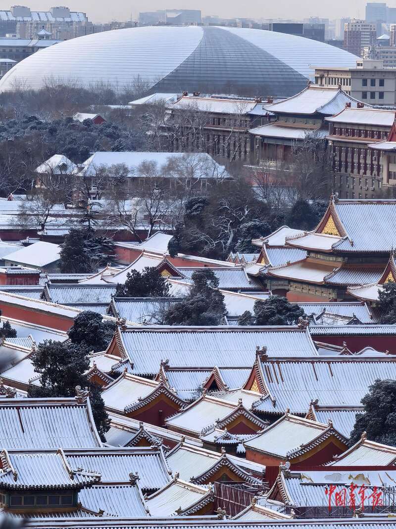 12月13日,从北京景山公园向南眺望,初雪后的故宫宫殿和远处的国家大剧院交相呼应。中青报·中青网记者 陈思阳/摄