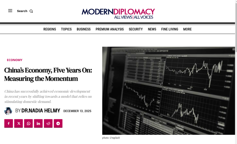 欧洲《现代外交》网站发表题为《中国经济在五年发展后的现状如何?——评估其增长动力与未来趋势》的署名文章。作者是埃及本尼苏伊夫大学副教授纳迪亚·赫尔米博士。文章说,近年来,中国成功转向依靠提振内需的发展模式,实现了经济持续发展。这不仅保障了经济稳定,还关乎中国国家安全与国际竞争力的核心考量。