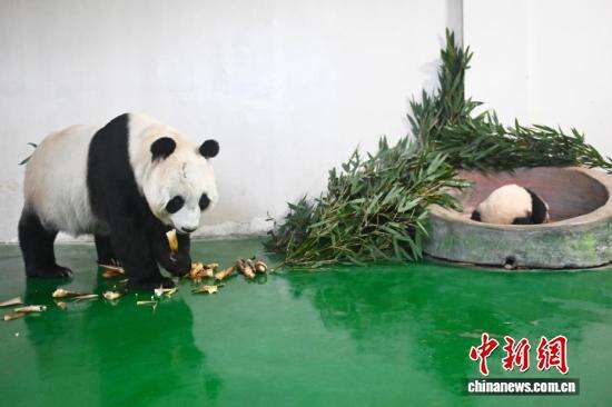 大熊猫妈妈与大熊猫幼崽“曼兰仔”互动。