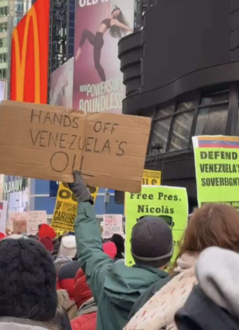 在纽约,人们聚集在时代广场的美国陆军征兵办公室外,手持反对对委内瑞拉开战的标语。