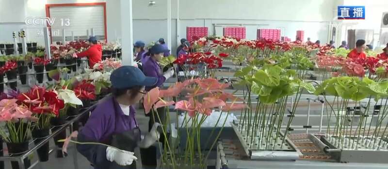 记者来到陕西省规模最大的鲜切花种植基地,这里是他们的包装车间。大家可以看到,我身后的8条生产线正在高速运转,工人们熟练地对鲜花进行分拣、包装。每一枝年宵花从采摘到成品仅需一小时,确保以更加新鲜的状态发往全国各地。车间的另一侧可以看到电商直播区也格外忙碌,主播们正通过线上平台向消费者推荐今年的年宵花系列礼盒,这种“线上线下融合保供”的模式,也是提升了工厂快速响应市场需求的能力。