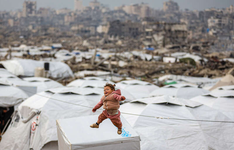 1月18日,巴勒斯坦加沙地带加沙城,贾巴利亚地区流离失所的巴勒斯坦家庭在以色列袭击造成的废墟中艰难维生。由于缺乏基本生活必需品,这些家庭在被毁房屋附近的临时帐篷中避难,努力应对寒冷天气。视觉中国供图