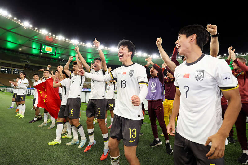 1月20日,沙特阿拉伯吉达,2026亚足联U23亚洲杯半决赛,中国U23男足以3:0战胜越南队,赛后全体成员庆祝晋级决赛。视觉中国供图