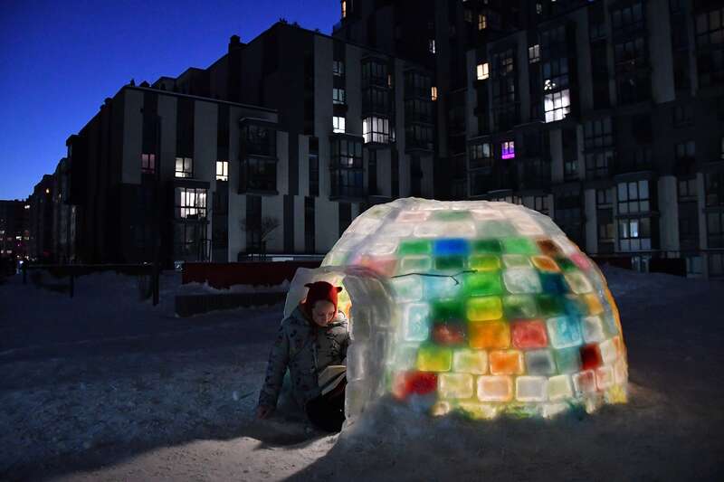 1月19日,乌克兰利沃夫,一栋公寓楼的院子里,一名女孩坐在五彩斑斓的冰屋里看书。近日,乌克兰能源基础设施持续受到俄方袭击,导致频繁停电和供暖困难,当地社区通过搭建冰屋等创造性的方式让孩子们参与户外活动。视觉中国供图