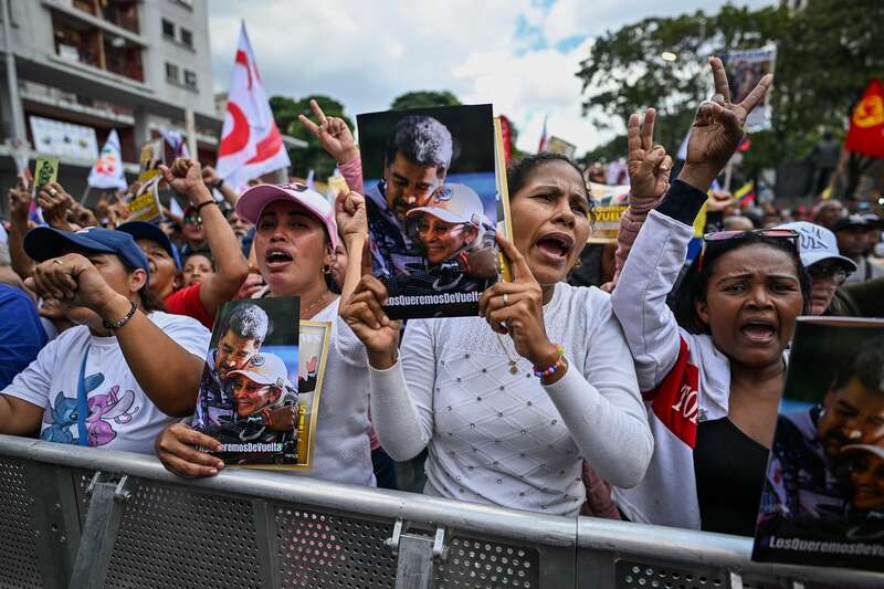 1月23日,委内瑞拉首都加拉加斯,民众手持马杜罗夫妇肖像,高喊口号,谴责美国此前对委进行的军事轰炸以及强行控制总统马杜罗及其妻子的行径,要求美方立即释放马杜罗夫妇。视觉中国供图