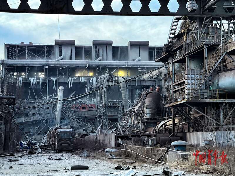 1月18日17时许,内蒙古包头市包钢板材厂爆炸事故现场,厂区内部因爆炸冲击波扭曲脱落的钢梁铁架。地面散落着许多金属碎片。1月18日15时03分,包钢板材厂炼钢作业部的一个650m³饱和水、蒸汽球罐发生爆炸。事故造成10人死亡,84人受伤。中青报·中青网记者 石佳/摄