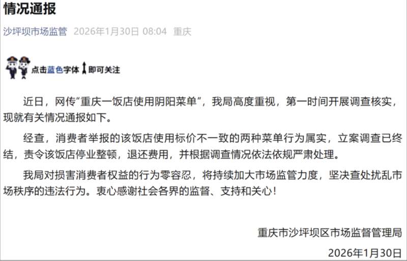 重庆市沙坪坝区市场监督管理局1月30日就网传“阴阳菜单”事件发布情况通报,称涉事饭店违规行为属实,责令其停业整顿,并向消费者退还费用。