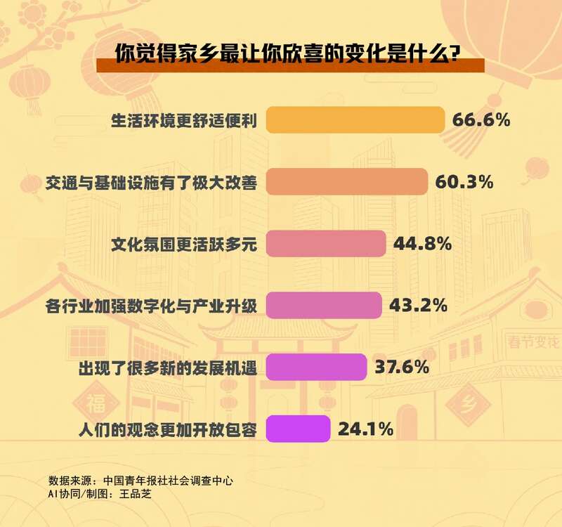 调查中,66.6%的受访青年表示,家乡最让人欣喜的变化是生活环境更舒适便利了,60.3%的受访青年对交通与基础设施的极大改善感到欣喜,44.8%的受访青年发现家乡文化氛围更活跃多元了,43.2%的受访青年为各行业加强数字化与产业升级这一变化感到开心,37.6%的受访青年发现家乡出现了很多新的发展机遇,24.1%的受访青年乐见人们的观念更加开放包容了。