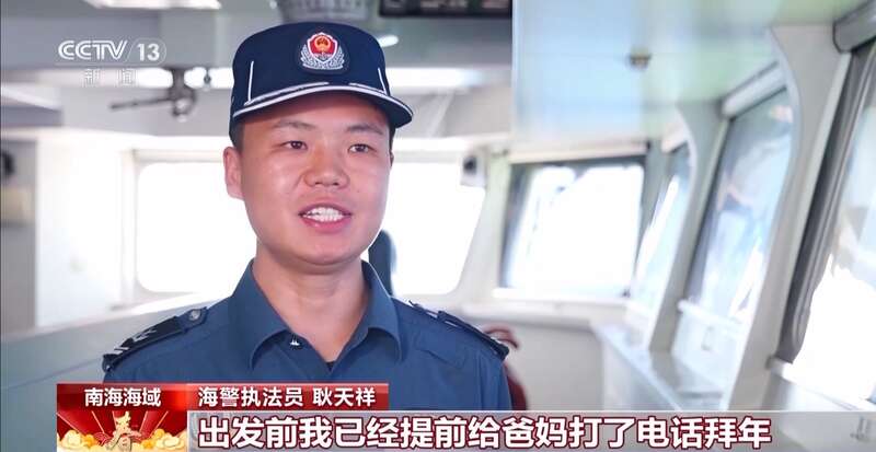 海警执法员 耿天祥:我们任务区域都是没有信号的,任务期通常持续一两个月,这期间大家都过着几乎“与世隔绝”的日子,出发前我提前给爸妈打了电话拜年。没有信号对我们来说都是常事,但我们捍卫祖国海洋权益不受侵犯的决心是不会变的。