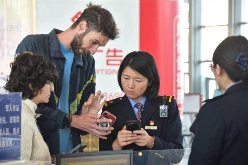 ↑ 2月16日,在云南红河站,铁路工作人员龚岸敏(右二)为旅客提供咨询服务。新华社发(薛莹莹摄)