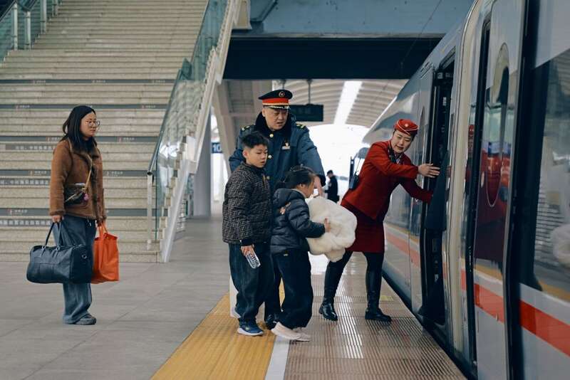 ↑ 2月16日,在南京火车站,乘务人员在站台上解答旅客问询。新华社发(苏阳摄)