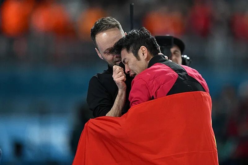 夺冠之后的宁忠岩流着热泪与荷兰外教约翰·德威特紧紧拥抱。