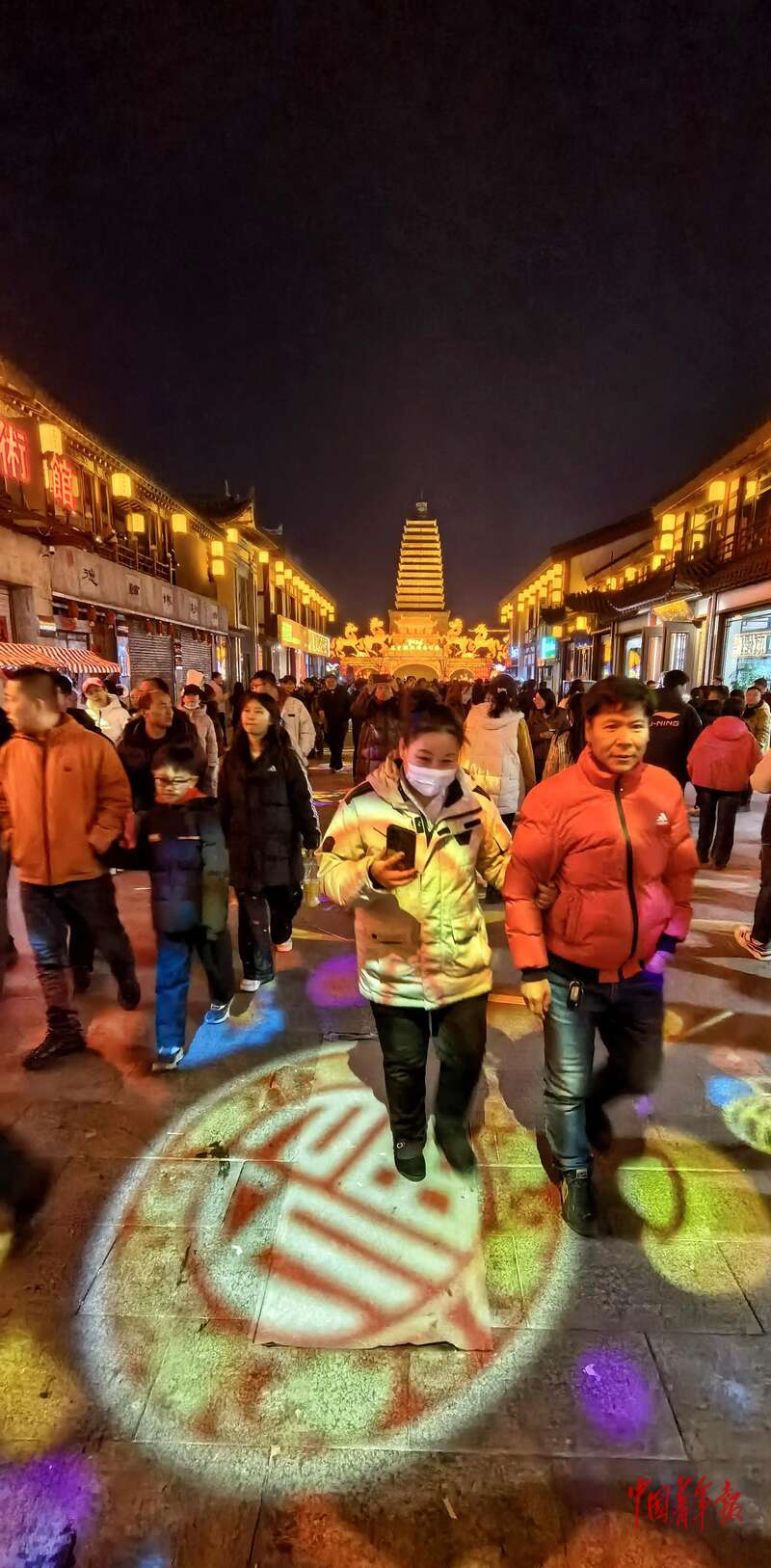 2月20日晚,辽宁朝阳,2026年辽宁朝阳迎春灯会现场,人们从投影在地上的“福”字图案边经过。中青报·中青网记者 李建泉/摄