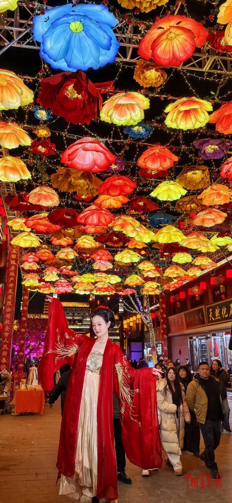 2月20日晚,辽宁朝阳,2026年辽宁朝阳迎春灯会现场,一位身穿古装的女士正在拍照。春节期间,当地北塔广场、慕容街灯火璀璨、人潮涌动,来自四面八方的市民与游客前来赏花灯、观非遗,在光影流转间解锁年味十足的新春佳节。据介绍,今年当地的迎春灯会以“灯”为媒,以“文”为魂,融合千年文脉、非遗技艺与现代科技力量,打造出一场兼具视觉震撼与情感温度的沉浸式光影盛宴。中青报·中青网记者 李建泉/摄