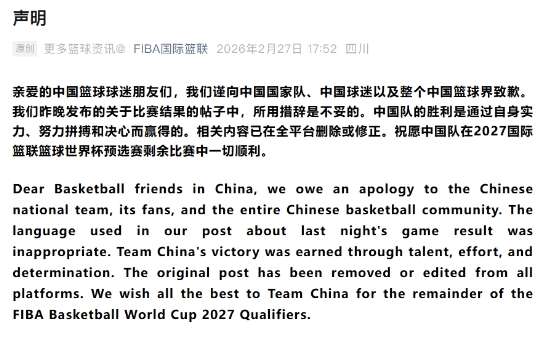 北京时间2月27日,国际篮联(FIBA)官方发布声明,就26日中国男篮对阵日本男篮赛后措辞不当一事,向中国男篮、球迷及中国篮球界正式致歉。