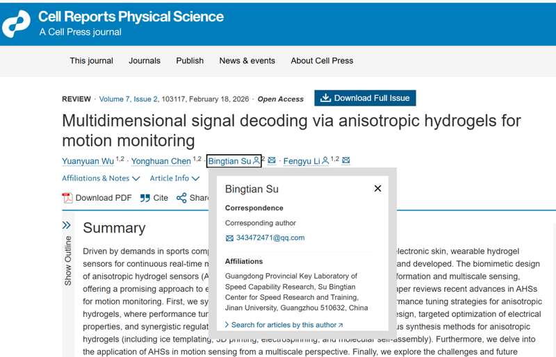 暨南大学化学与材料科学学院李风煜教授、暨南大学体育学院苏炳添教授作为共同通讯作者(吴媛媛为论文第一作者),在Cell子刊Cell Reports Physical Science上发表了题为:Multidimensional Signal Decoding via Anisotropic Hydrogels for Motion Monitoring 的综述论文。