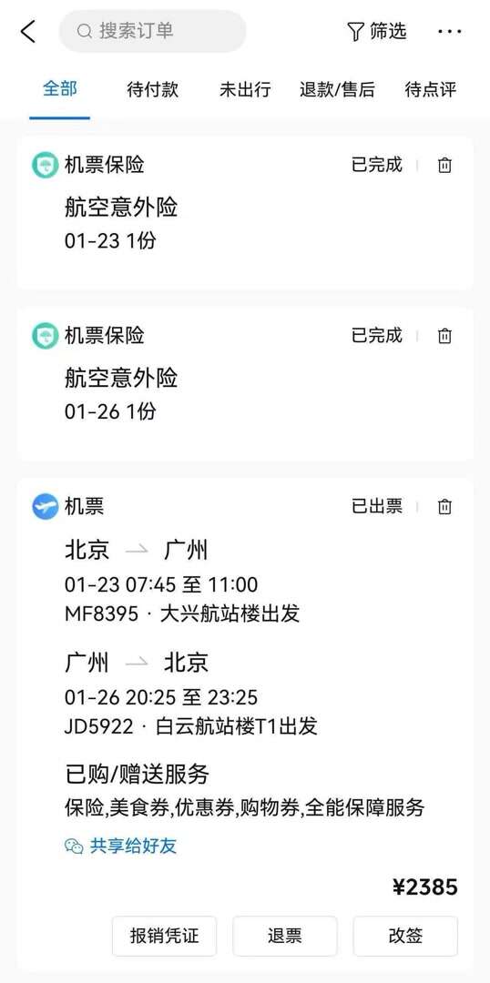任欢向记者提供的平台订单页面截图显示,订单总额为2385元,其中包含北京至广州往返机票、2份航空意外险,页面下方标注“已购/赠送服务 保险、美食券、优惠券、购物券、全能保障服务”。