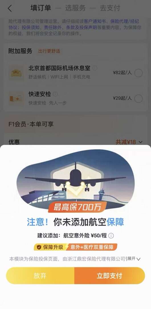 除了价格展示误导外,支付环节的诱导设计同样令人防不胜防。飞猪旅行App在最终付款阶段,会强制弹出“航空意外险”推荐页面,下方“放弃”和“确认支付”两个选项文字表述模糊、指向不清,不少消费者误以为“确认支付”是继续完成机票付款,点击后才发现“被购买”意外险。