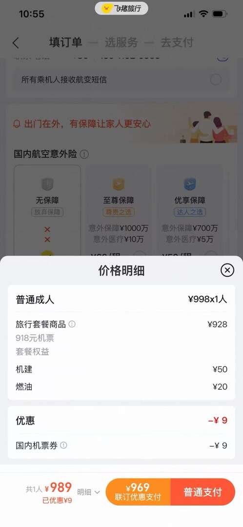 分别对前三档价格进行下单测试后记者发现:表面标价最低的第一档,实际需捆绑63元延误险,叠加机场建设费、燃油附加费并抵扣优惠券后,最终实付1044元;而第二、三档若选择“无保障预定”,实付价格仅为989元、990元,对于不需要保险的消费者反而更划算。返回初始报价页面可见,第一档价格下方有“延误保障+63元”和“更换”等小字,记者在客服指导下点开“更换”后,才发现里面还有其他选项。