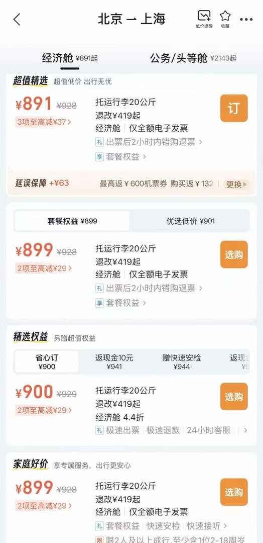 记者在飞猪旅行App随机选取一班北京飞往上海的航班进行实测。平台页面展示出4档购票选项,下方还设有“更多报价”下拉框。其中,排在首位、标注“超值精选”的选项标价最低,显示为891元,第二、三档价格分别为899元、900元,第四档为亲子家庭专属选项。
