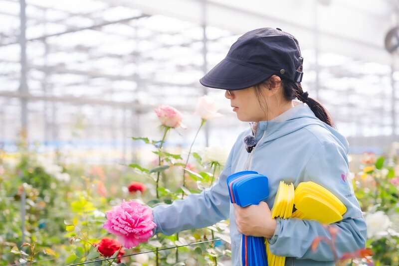 云南昆明呈贡,中午日头极盛,蔡艳飞依然穿梭在她的“减配”大棚。时而“辣手摧花”,时而插下蓝牌,从最初全是国外舶来品,到自主选育的中国苗排着长队等待入棚,“宝华”“文秀”“娇龙”等网红月季新品种名收获了十亿级的阅读量、百万级的评论,蔡艳飞和团队为鲜切花品种端突围闯出了一条从跨界到破圈的新路。