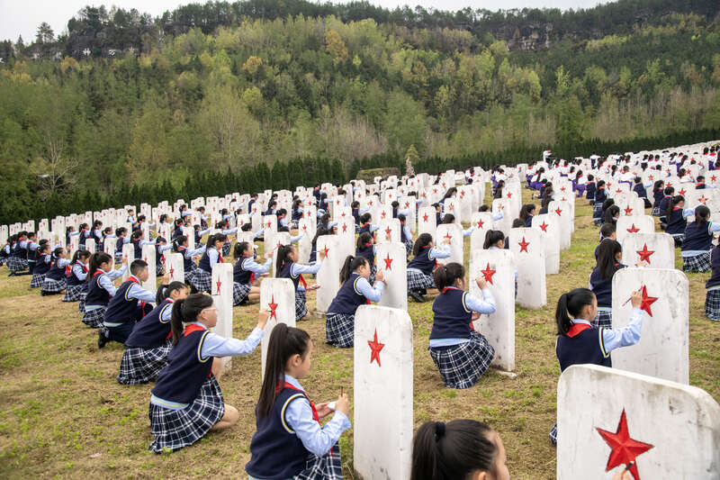 核心墓区,少先队员重温入队誓词,共青团员重温入团誓词;纪念碑前,“我为烈士寄封信”优秀作品依次诵读;无名烈士墓区,同学们手持工具为墓碑描红。