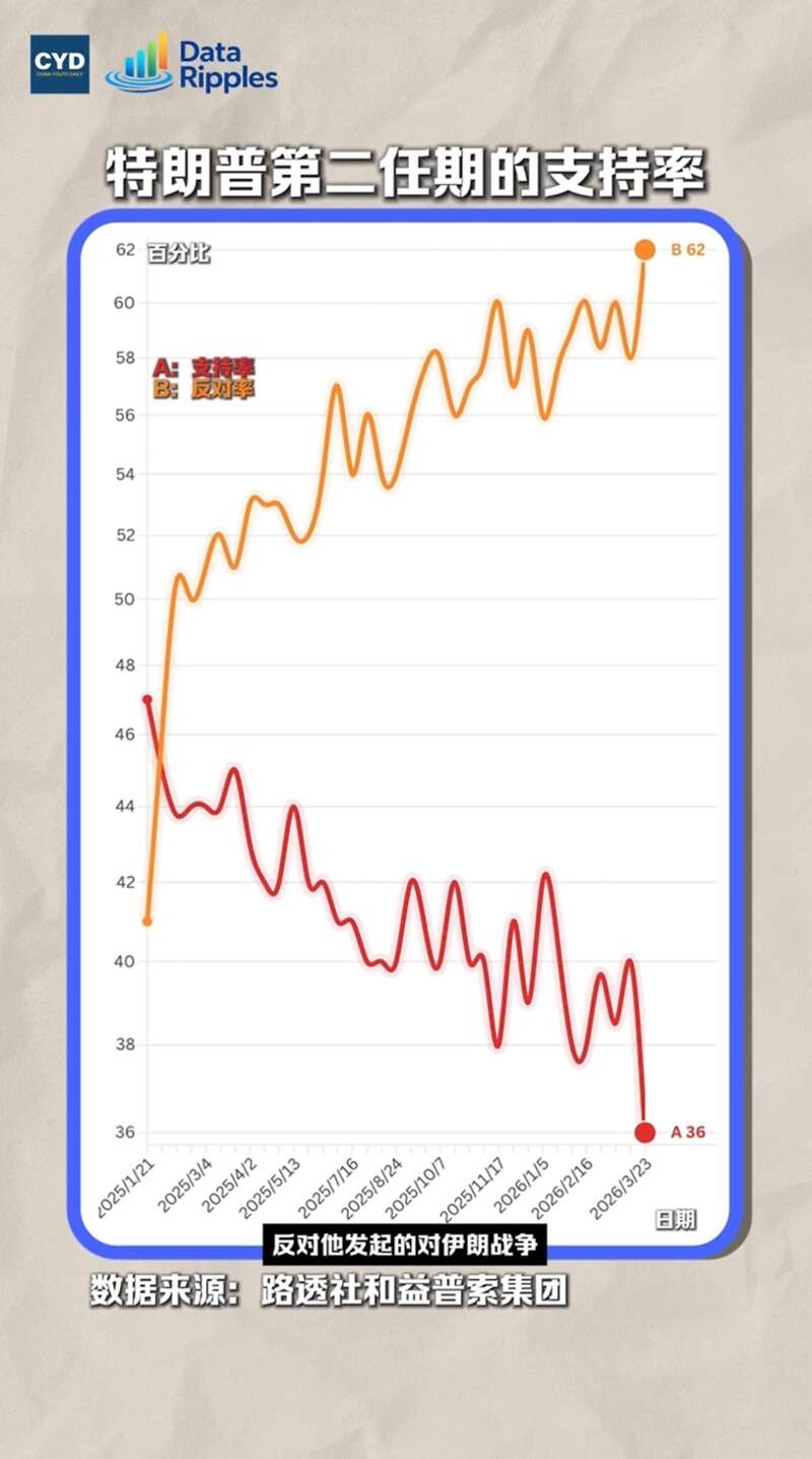 据中国青年报客户端,3月24日最新民调显示,特朗普支持率跌至重返白宫以来最低点。油价飙升、对伊朗战争引发争议,成为主要拖累因素。在最关键的经济问题上,仅29%受访者认可其表现。