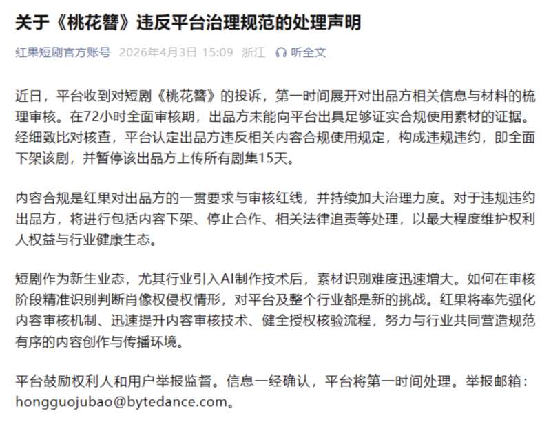 近日,有网友称,AI短剧《桃花簪》在未经授权的情况下,擅自使用其此前拍摄的照片,进行AI处理,用于角色“刘大”的相关剧情,引发热议。3日,“红果短剧官方账号”微信公众号发布声明:全面下架该剧,并暂停该出品方上传所有剧集15天。