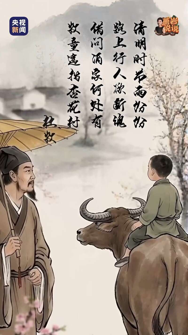 再看杜牧。一到清明,大家都会想到这首诗:“清明时节雨纷纷,路上行人欲断魂。借问酒家何处有,牧童遥指杏花村。”我们在生活里难免有心情低落的时候,透过诗句我们看到,杜牧没有停在情绪里,而是借一杯小酒、在一路烟雨中化解心绪,放到今天,就是一场说走就走的旅行,用春光治愈emo,既诗意又接地气。
