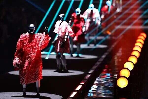 △3月18日,广东汕头,第五届潮汕国际纺织服装博览会开幕大秀上,人形机器人“模特”在走秀。展会首次设立AI及创新服务展区,集中展示AI设计、智能制造等前沿成果。刘占崑/摄