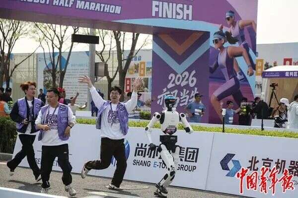 △4月19日,北京经济技术开发区,2026北京亦庄半程马拉松暨人形机器人半程马拉松比赛现场,一名人形机器人选手冲过终点线,队员们欢呼庆祝。中青报·中青网记者 赵迪/摄