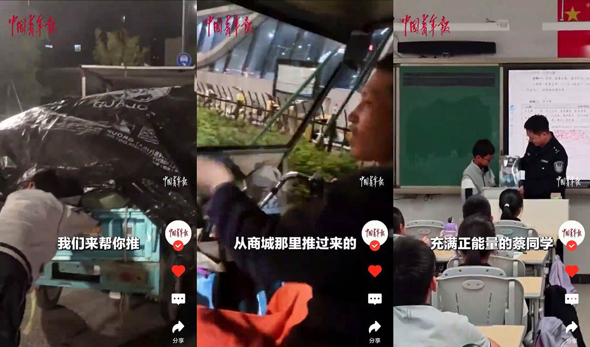 好样的,少年!看到环卫工人吃力地推着堆满货物的三轮车,少年一路小跑上前帮忙。