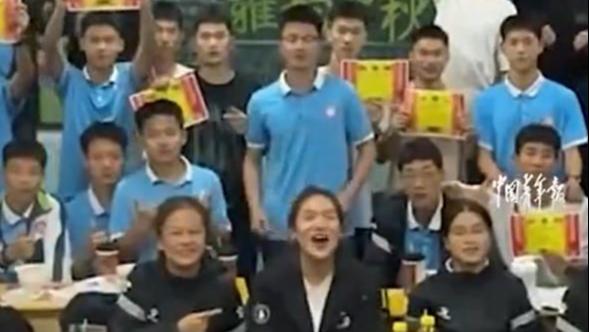 体育班学生在学校运动会上获得20多枚奖牌、30多张奖状,同学们把奖牌挂在一根竹竿上,当作礼物送给班主任。