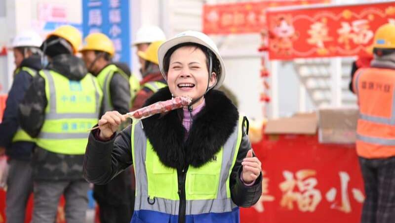 青年志愿者送年货,工地集市暖人心