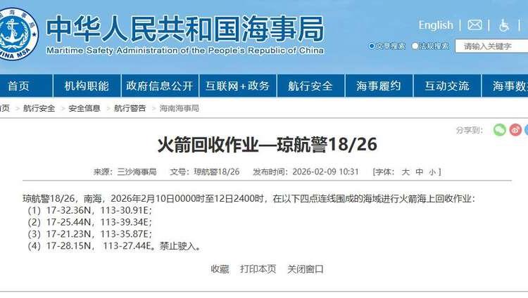 南海部分海域进行火箭海上回收作业,禁止驶入。