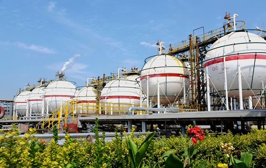 鲜花绿植簇拥着球罐区