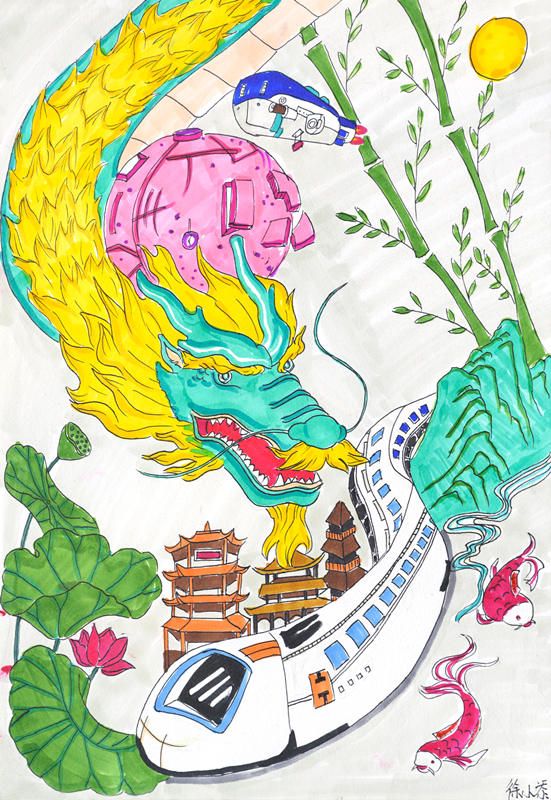 作品简介:龙在中国文化中代表着奋发向上的进取精神,独具一格。“和谐号”动车就像巨龙一样载着人们的美好愿景,穿行在祖国的大江南北。画中月亮则代表着阖家团圆的美好祝愿,荷叶代表着吉祥如意。而红鲤乃祥瑞之物,绿竹寓意中国未来的发展像竹子一样节节高。在2035年,我们的祖国遍地绿水青山,太空中飞船穿梭,科技与绿色完美结合。