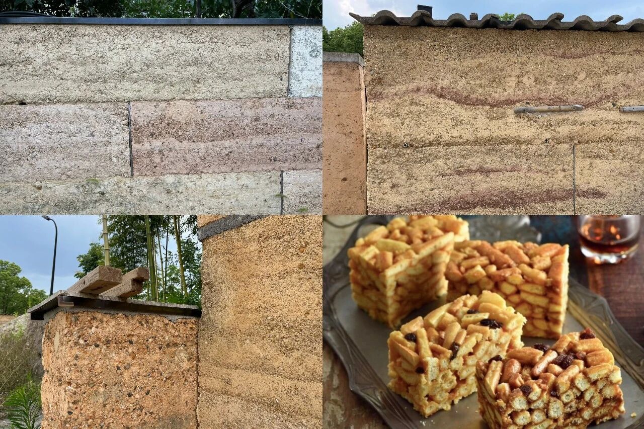 为了平衡夯土的强度、收缩性(导致裂缝),我们需要像揉面团一样,将不同的配料拌在一起、揉在一块:翻炒混合,视湿度调节用料,像炒糖浆那样控制“火候”。夯土墙时,分层夯实,就像做沙琪玛不能一股脑倒进去,而要一层层压紧冷却,才能成型。这种层层叠加的方式,不只是技术需要,也蕴含着时间感与节奏:不是一次成型的现代速度,而是与土性协商、顺应气候与材料状态的慢工。