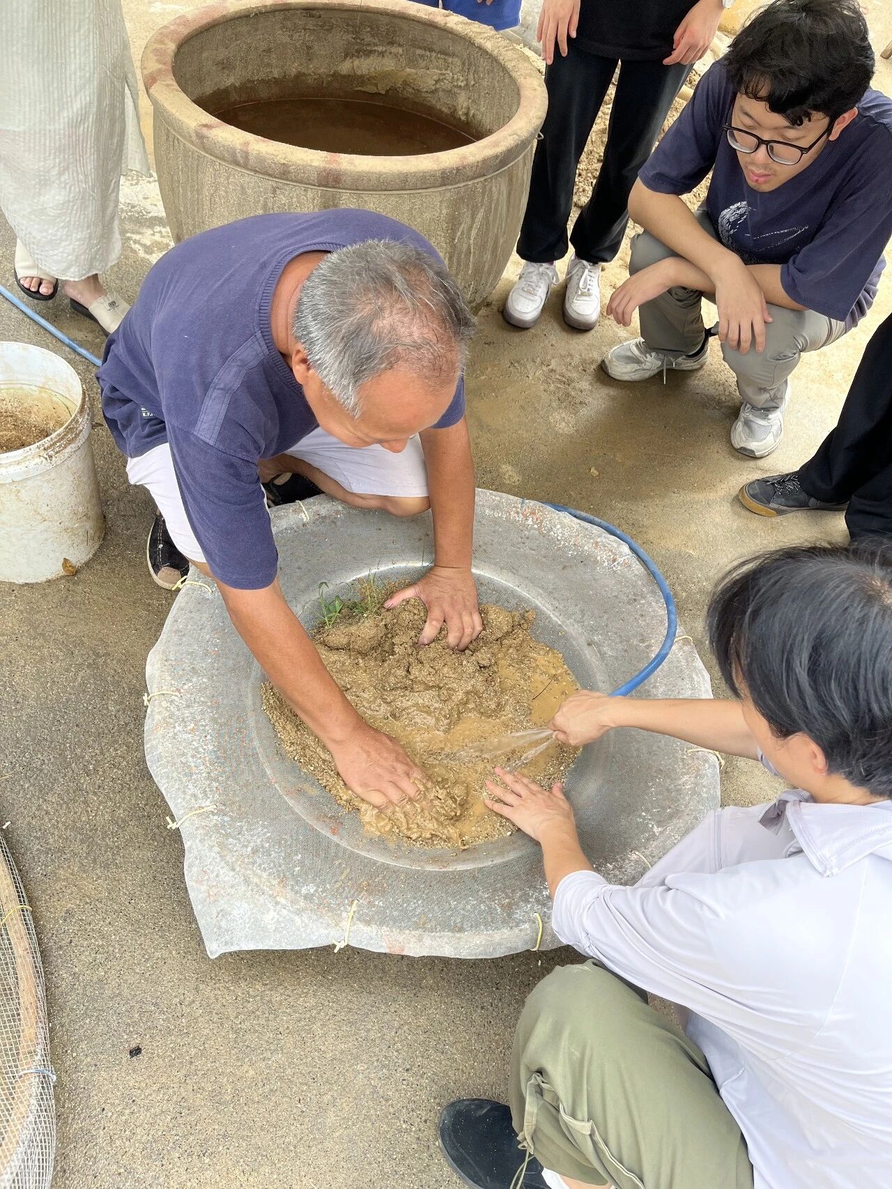 我们使用14目、20目等较细密的筛网置于一口装满水的大缸之上,将泥土铲到筛网上,并用手搓洗泥土,分离不同颗粒度的泥土,这便是水洗。用4目筛网直接过筛过滤出粗料砂子,再加上用14目过滤出的细料砂,就成为了夯土地面(2cm以下)的“骨料”。再加膏状石灰(用于增强抗压强度与耐久性),以及粘土用于调色。