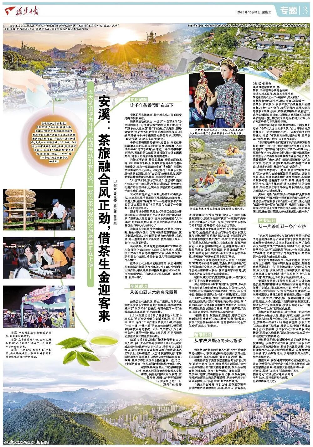 9月29日至10月3日,“五镇联动・秋茗斗彩迎宾”系列专场活动在安溪县感德、西坪、祥华、芦田、龙涓5个主产茶乡镇接力上演,打造出“一日一镇、一镇一品”茶文旅体验矩阵,吸引到乡镇深度体验的客流上万人。国庆前5天,5个茶叶主产乡镇茶叶销售额达1.45亿元,用多元消费场景激活茶文旅经济新动能。