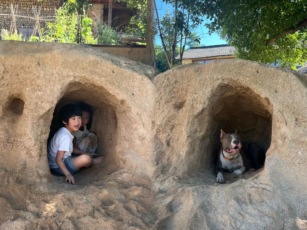 配泥料、洗泥的过程就是制造机会让小孩们能够玩泥巴,可孩子们好像总能从“无聊”平常中生出无尽的趣味来:泥土作坊前的一堆土,孩子们自行开发出无数种玩法。孩子们呆在那就能玩一整天,玩出一座洞穴城堡——狗狗阿扁也爱在里面乘凉,成了它的新窝。这大概是小孩天然对泥土的喜爱,对无化学加工的大地土壤天然的身体亲近性,产生的奇妙磁场。