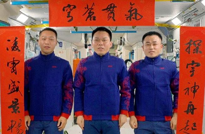 中国空间站贴春联 神十七航天员换“祥云服”给全国各族人民拜年