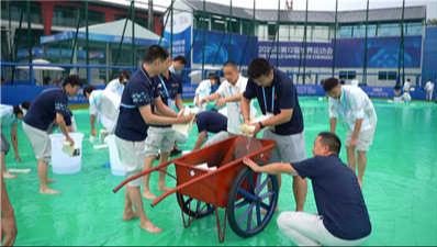 合力将防水布拉至场外,确保第一竞赛单元顺利进行。