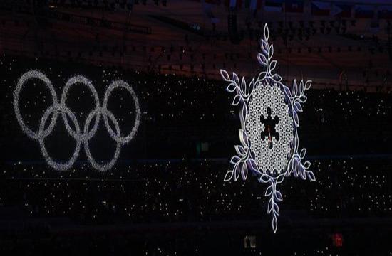 各国运动员、观众等在雪花中庆祝胜利、享受冰雪带来的喜悦