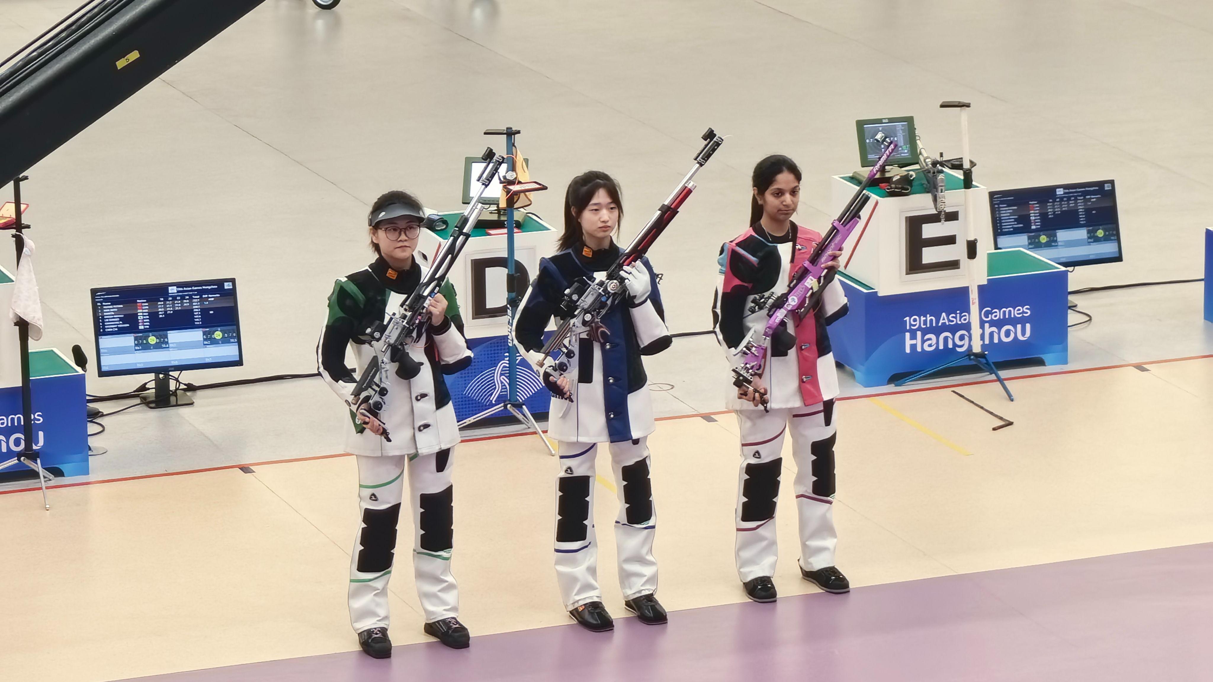 黄雨婷夺冠成绩252.7环,韩佳予获银牌,成绩251.3环。