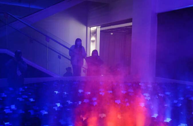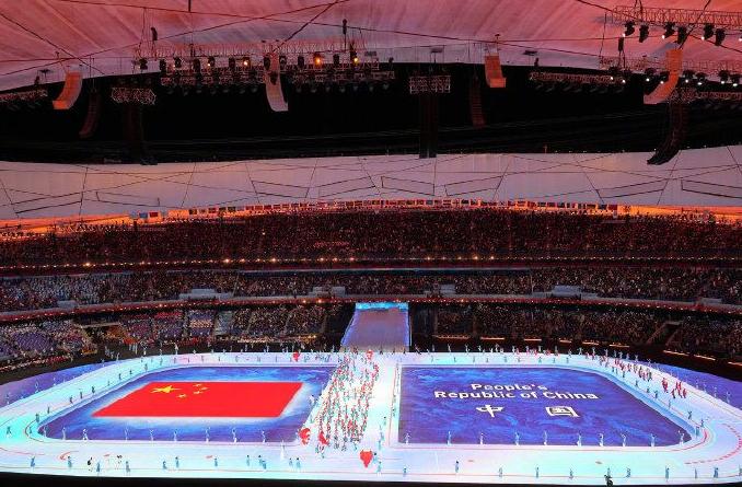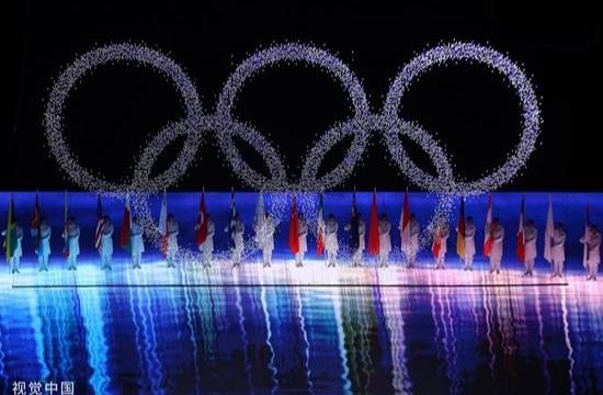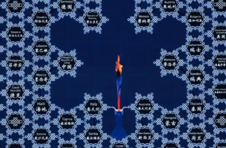 冬残奥会仪式前表演环节,鸟巢顶部打出的光束,在夜空中形成缓缓旋转的白色花朵。