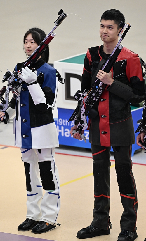 9月26日,杭州亚运会射击混合团体10米气步枪决赛,盛李豪/黄雨婷夺金。视觉中国供图