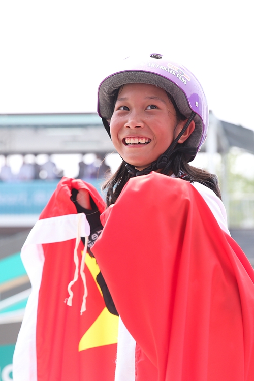 9月27日,杭州亚运会滑板女子街式决赛,13岁崔宸曦夺金成为中国最年轻亚运冠军。视觉中国供图