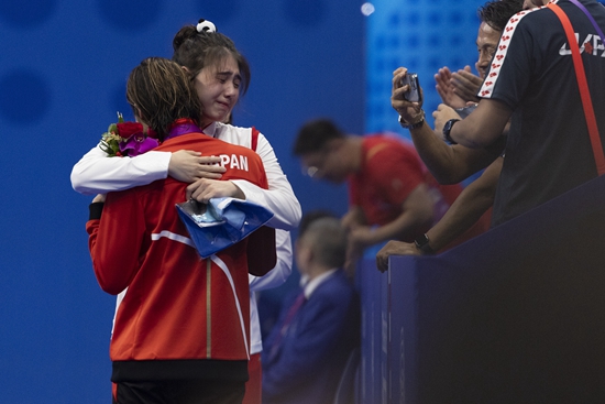 9月29日,杭州亚运会女子50米蝶泳决赛,张雨霏和池江璃花子分获金牌和铜牌。两人动情落泪拥抱。视觉中国供图